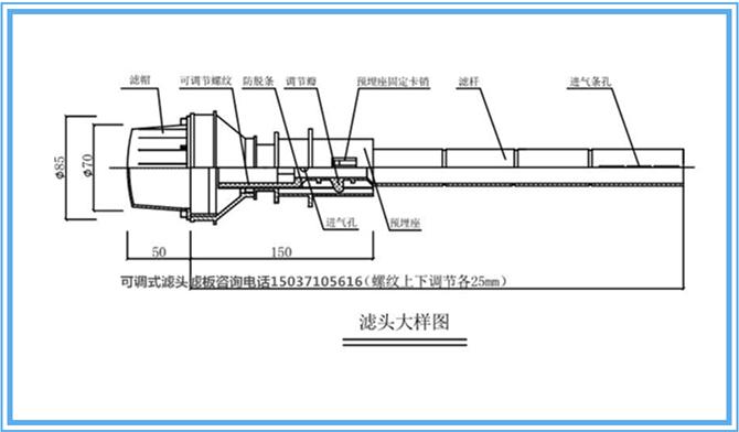 濾桿內徑17±0.5mm,帶有外絲扣。濾桿上端設有一個圓形的進氣孔,孔徑2±0.05mm;下端設有一個狹長的進氣孔,孔長度65±0.05mm,寬度1.5±0.05mm。